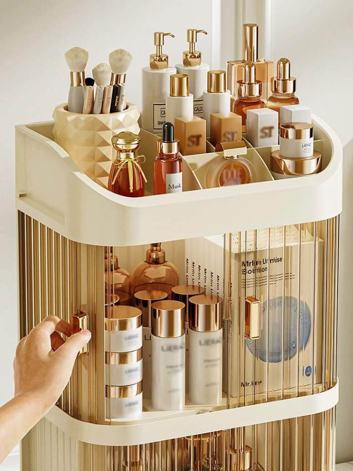 A caixa de armazenamento de cosméticos foi projetada para se encaixar perfeitamente na sua penteadeira, proporcionando um toque de charme e tornando o seu espaço de beleza muito mais prático. Com suas duas camadas espaçosas, você poderá separar e organizar seus cosméticos de forma eficiente, deixando tudo sempre organizado e visível.